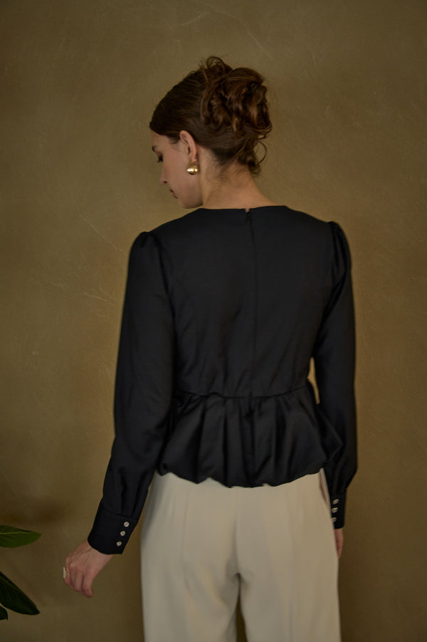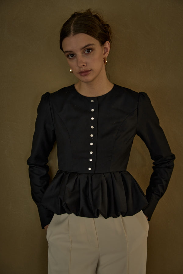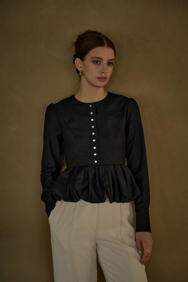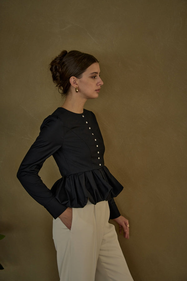 ふんわりと弾むバルーンペプラムがウエストラインを美しく整え、端正なシルエットに女性らしい柔らかさを添えます。