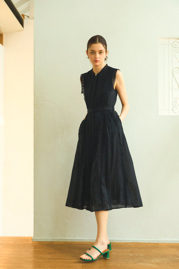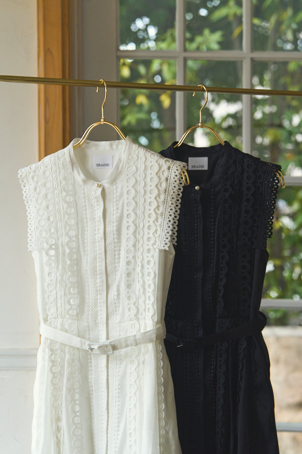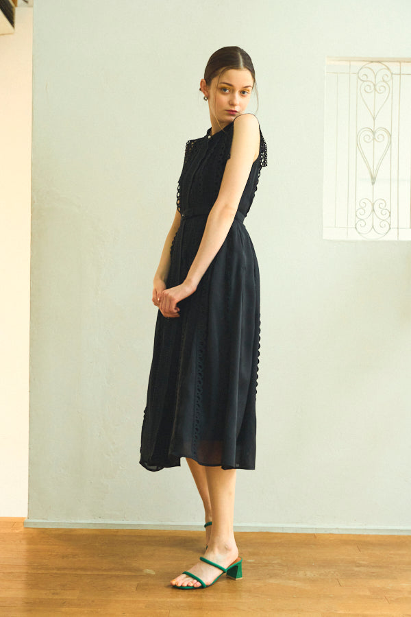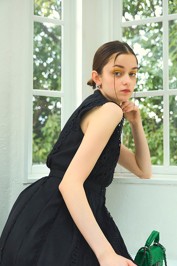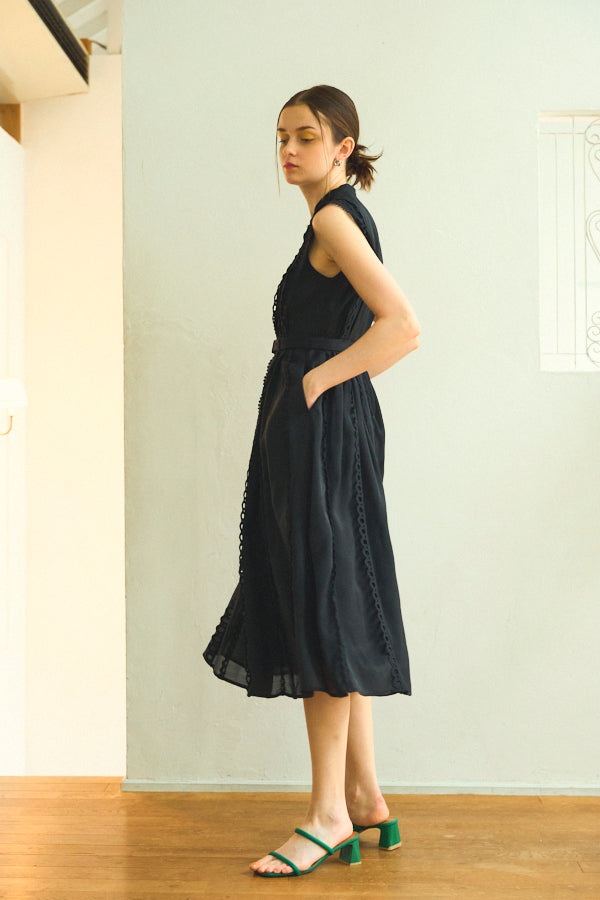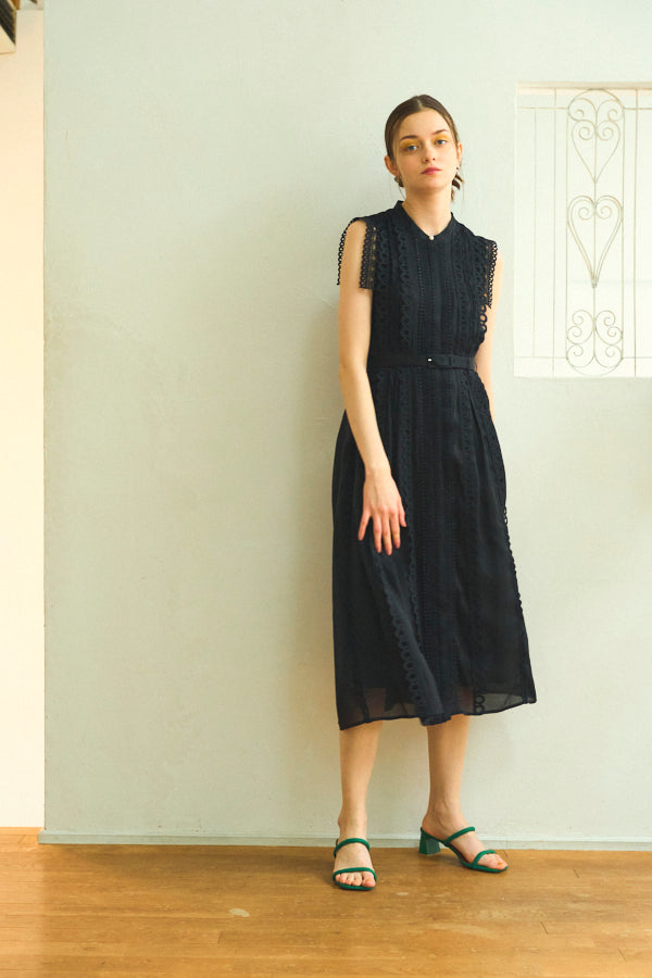 数種類のレーステープをあしらったエレガントフェミニンなワンピース。