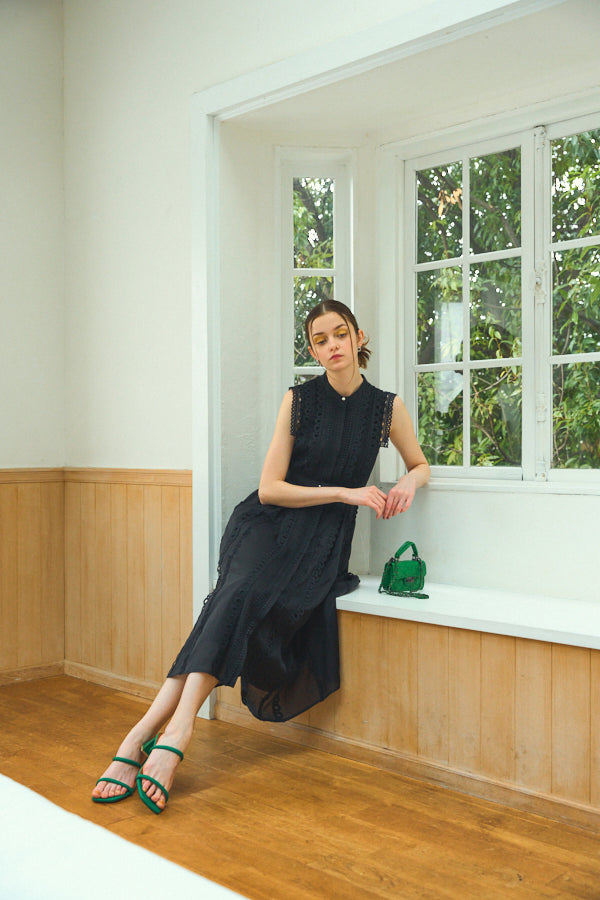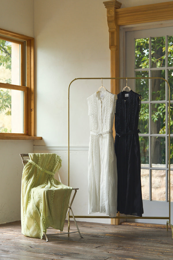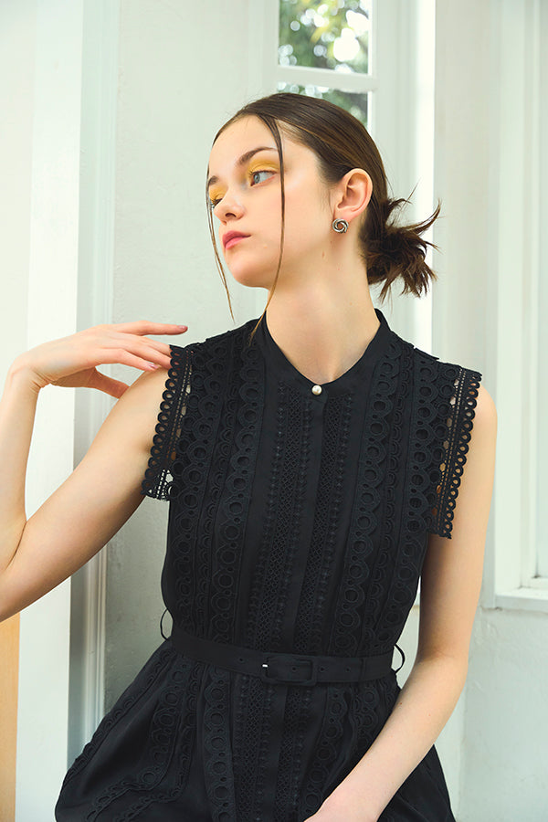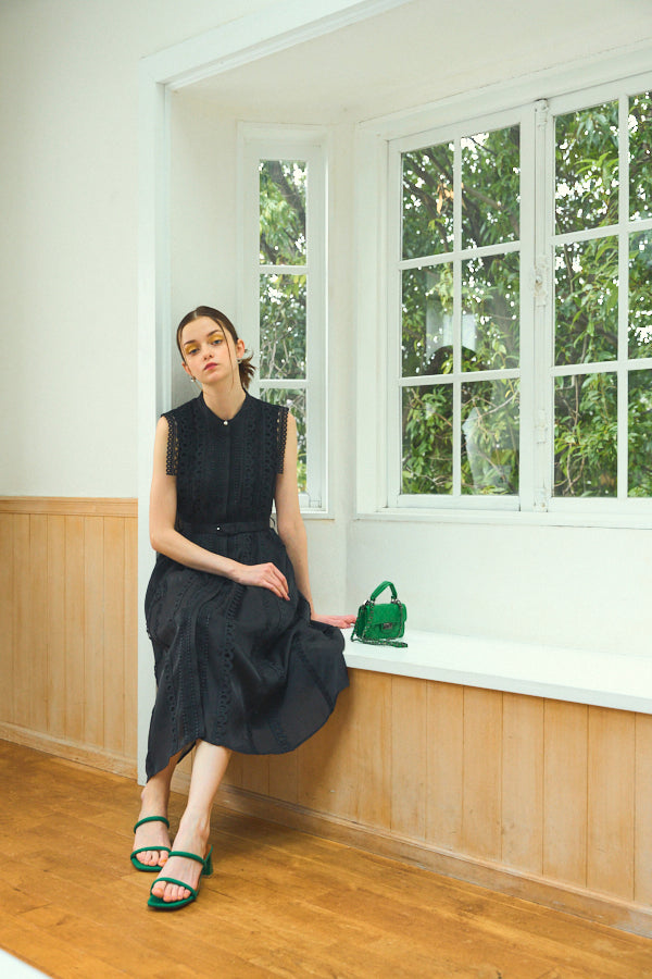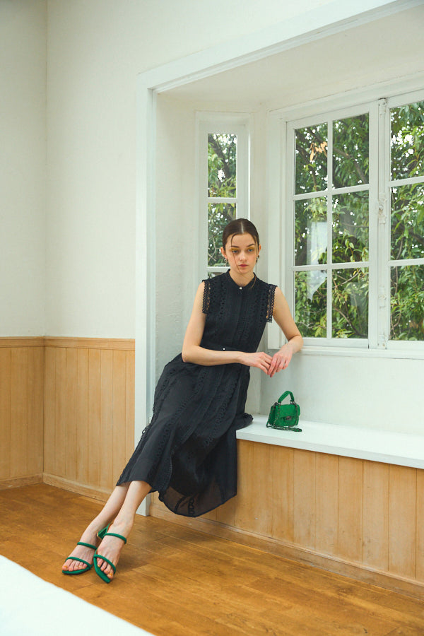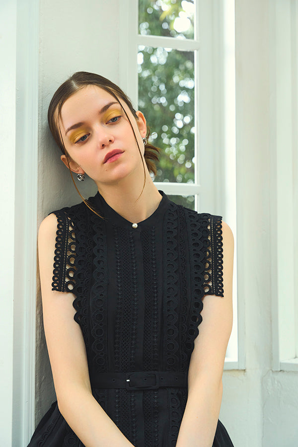 数種類のレーステープをあしらったエレガントフェミニンなワンピース。