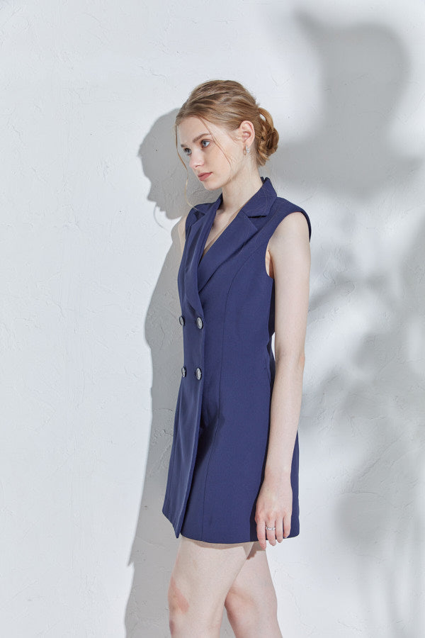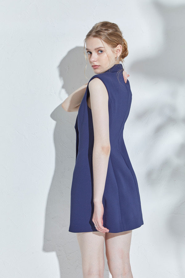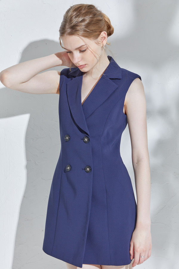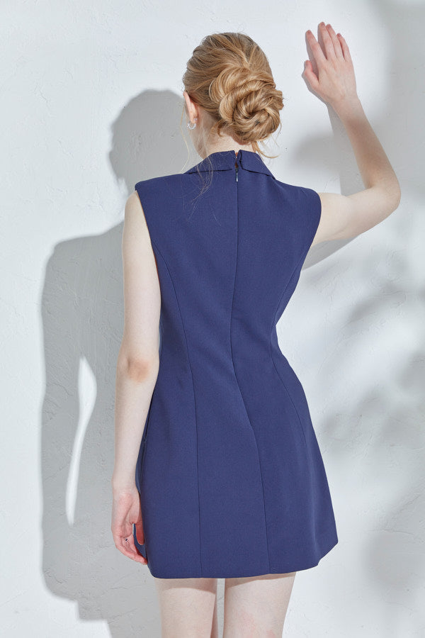 構築的なカッティングに存在感あるWブレストのレディなテーラーリングが映えるミニマムワンピース。
