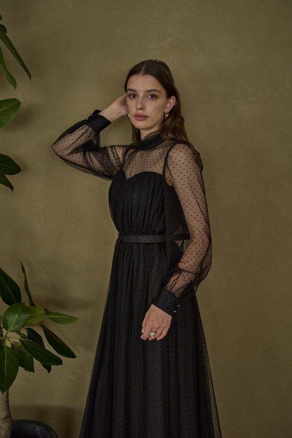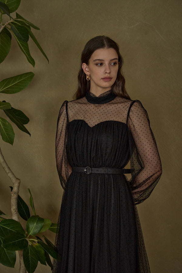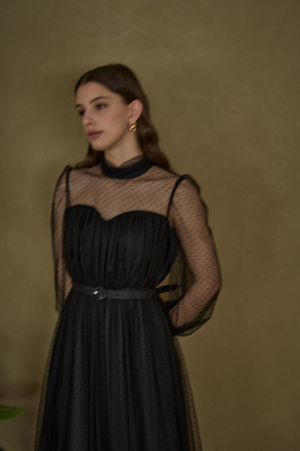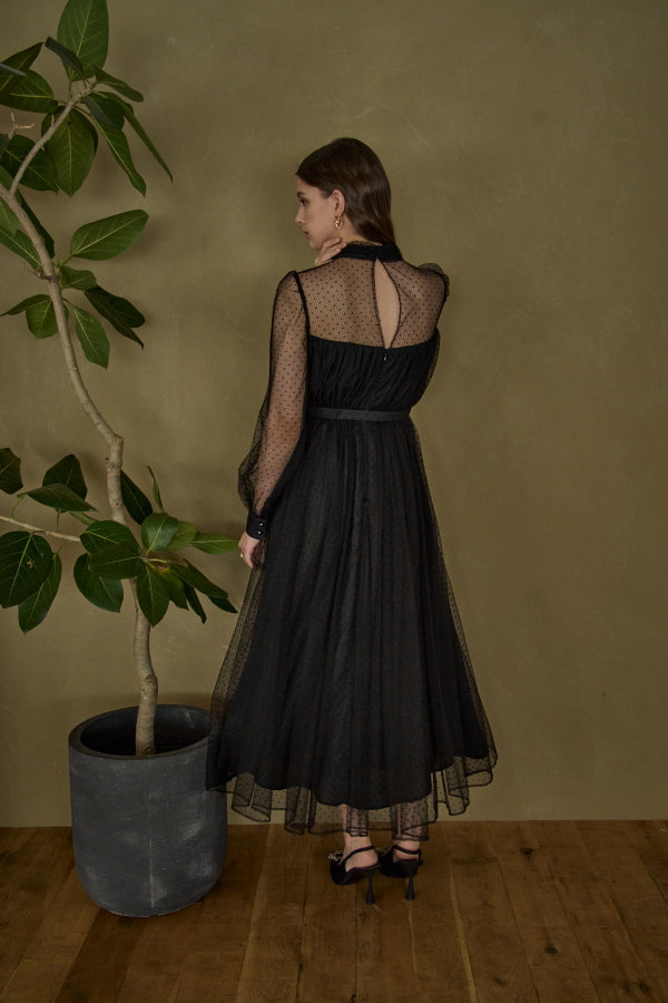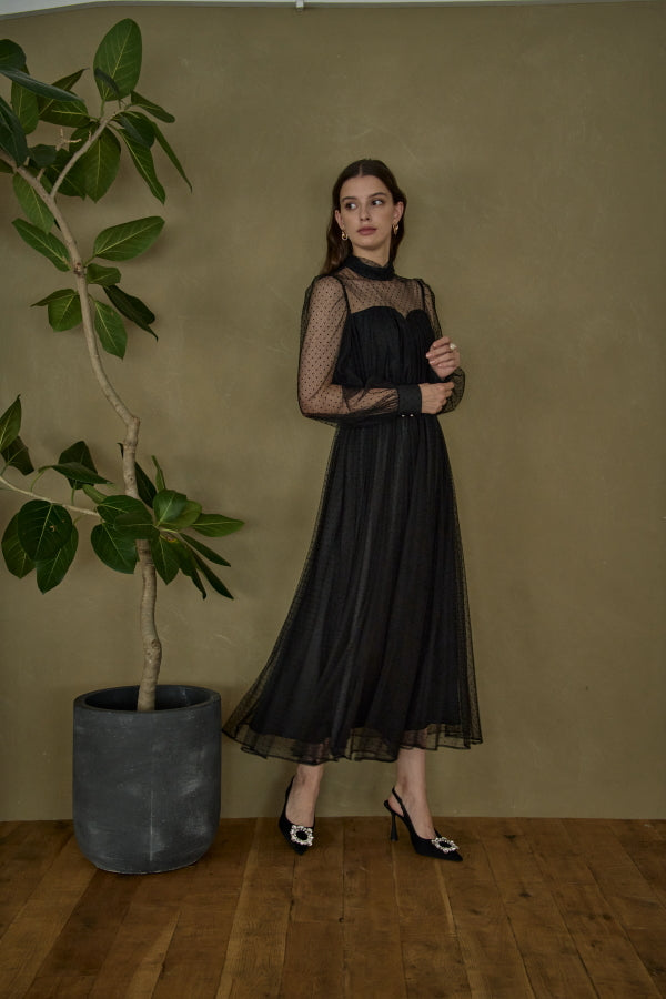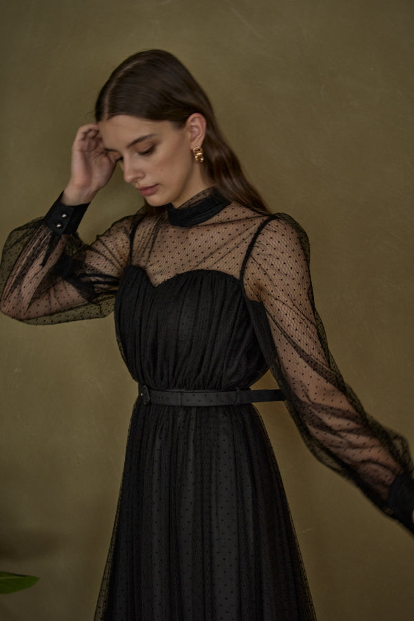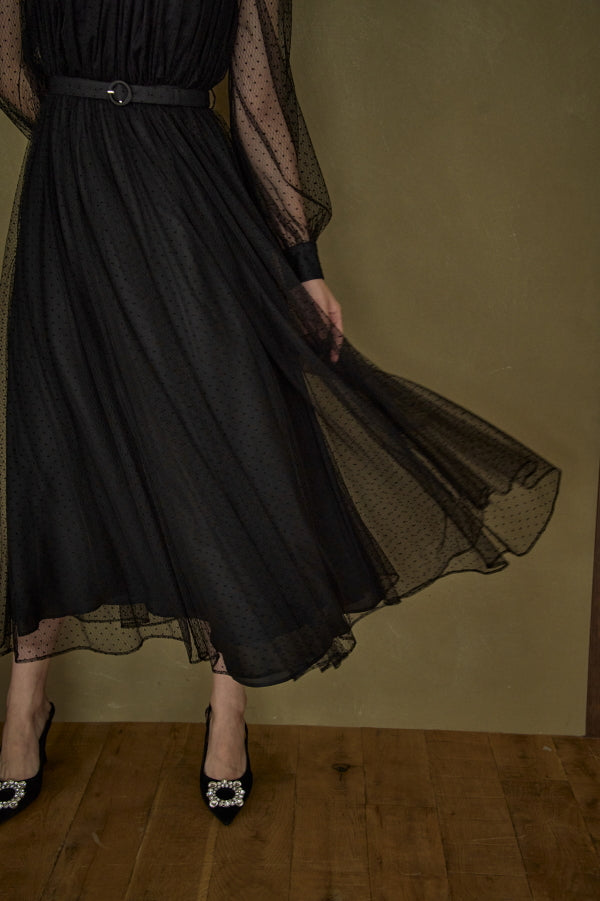 繊細なドットチュールを惜しみなく重ねた、エアリーでリュクスな佇まいのドレス。