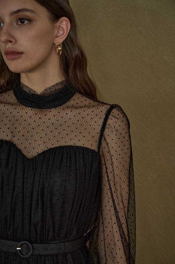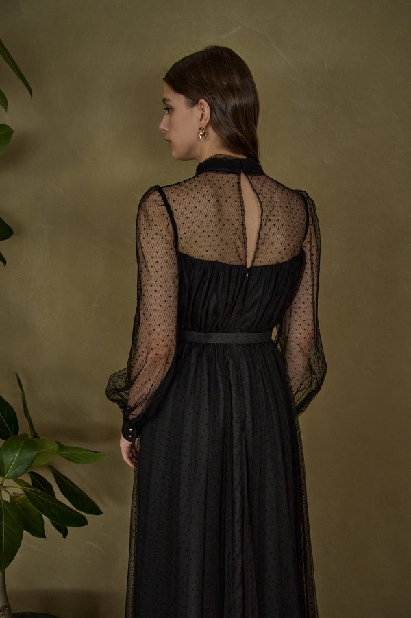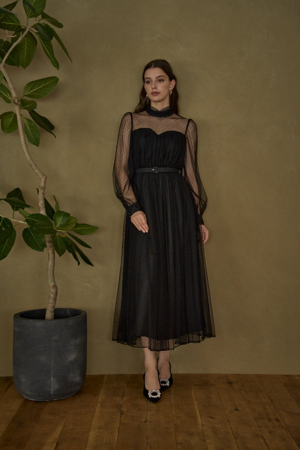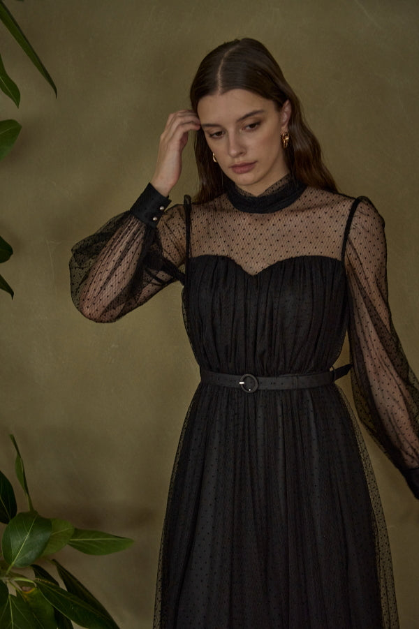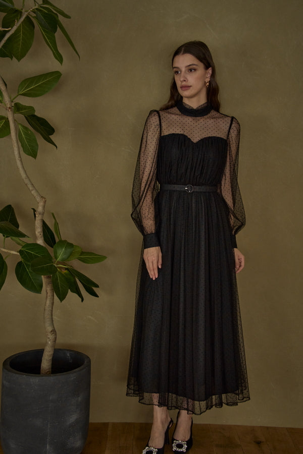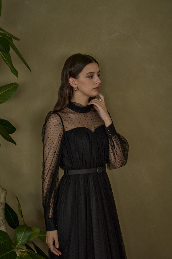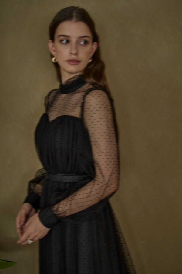 繊細なドットチュールを惜しみなく重ねた、エアリーでリュクスな佇まいのドレス。