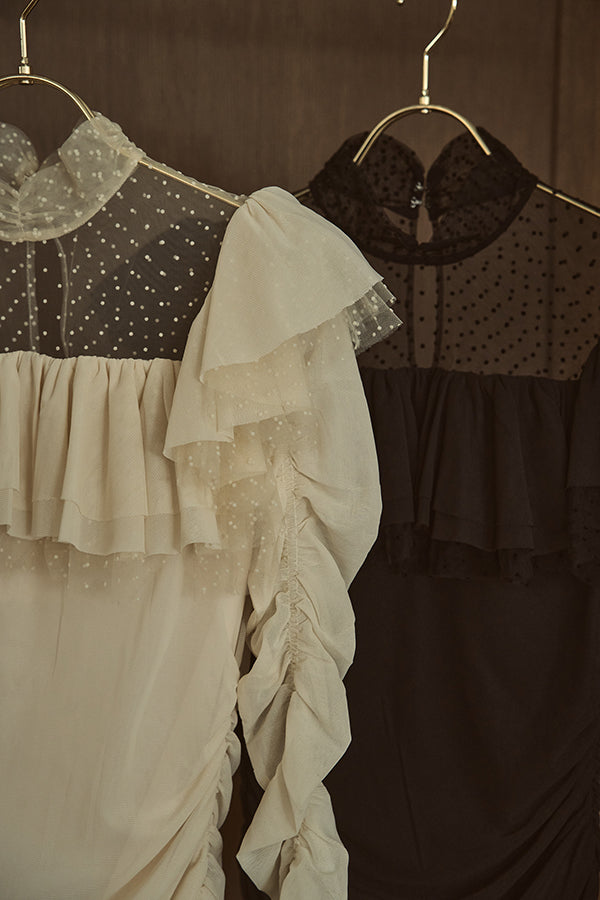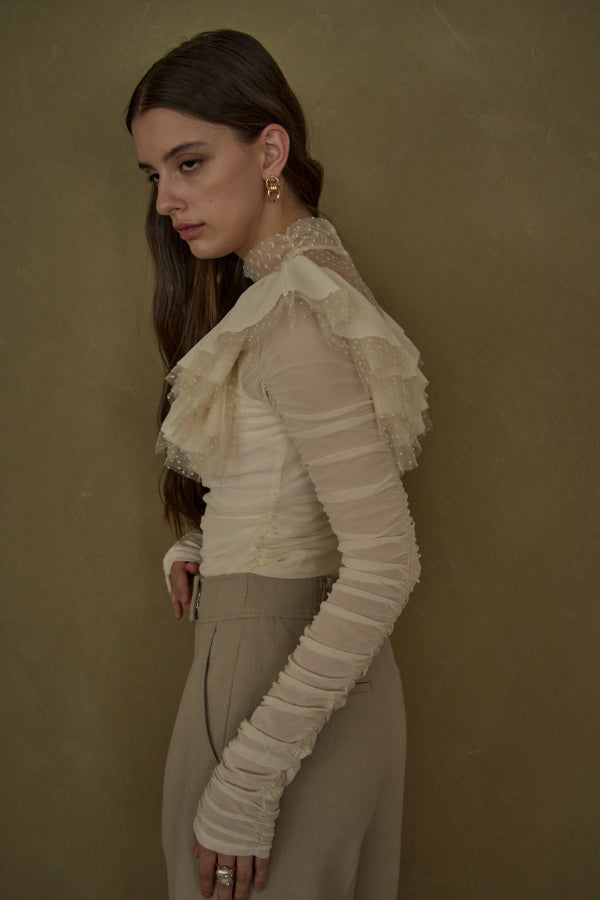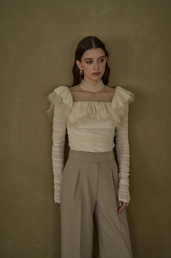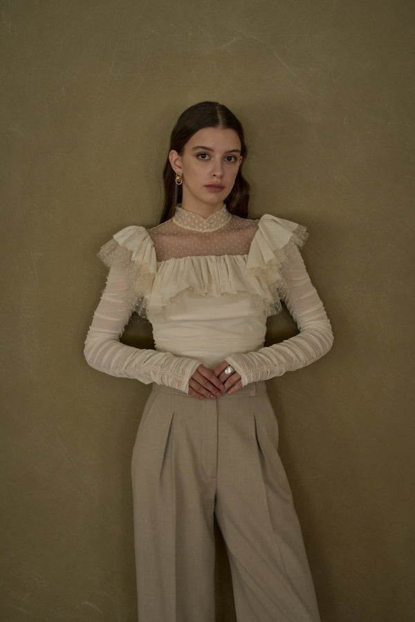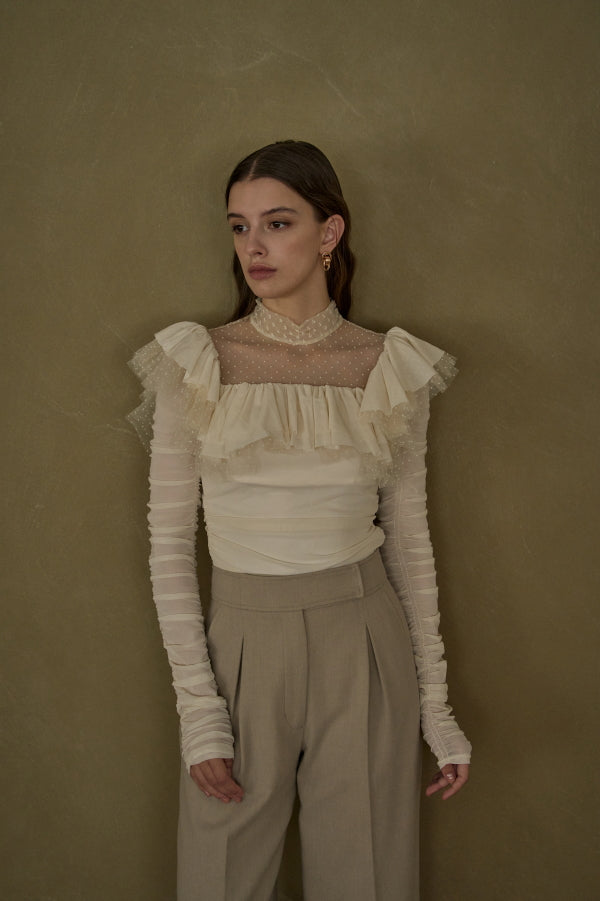 幾層にも重ねたラッフルが顔まわりを華やかに彩り、デコルテに広がるシアーな透け感が女性らしい抜け感を添えるトップス。