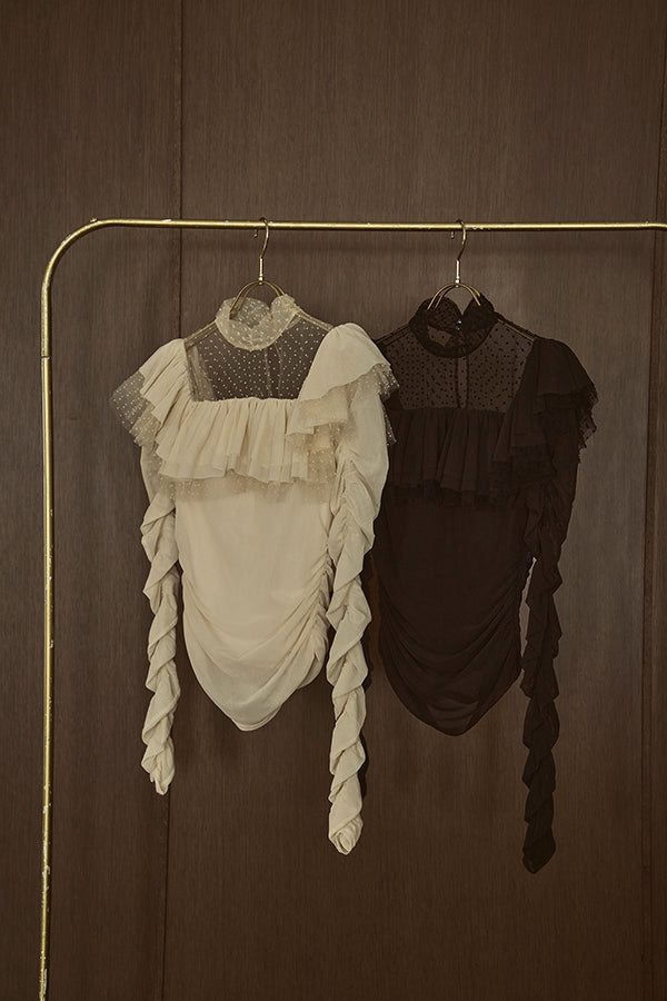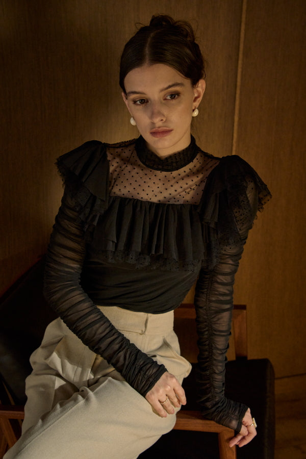幾層にも重ねたラッフルが顔まわりを華やかに彩り、デコルテに広がるシアーな透け感が女性らしい抜け感を添えるトップス。
