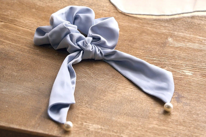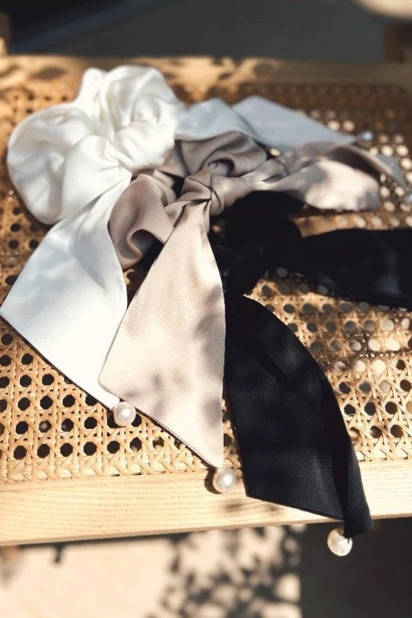 しなやかなサテンリボンにパールをあしらった、華やかで女性らしいシュシュ。髪に結ぶだけでニュアンスのある動きが生まれ、手首に添えても上品なアクセントになります。